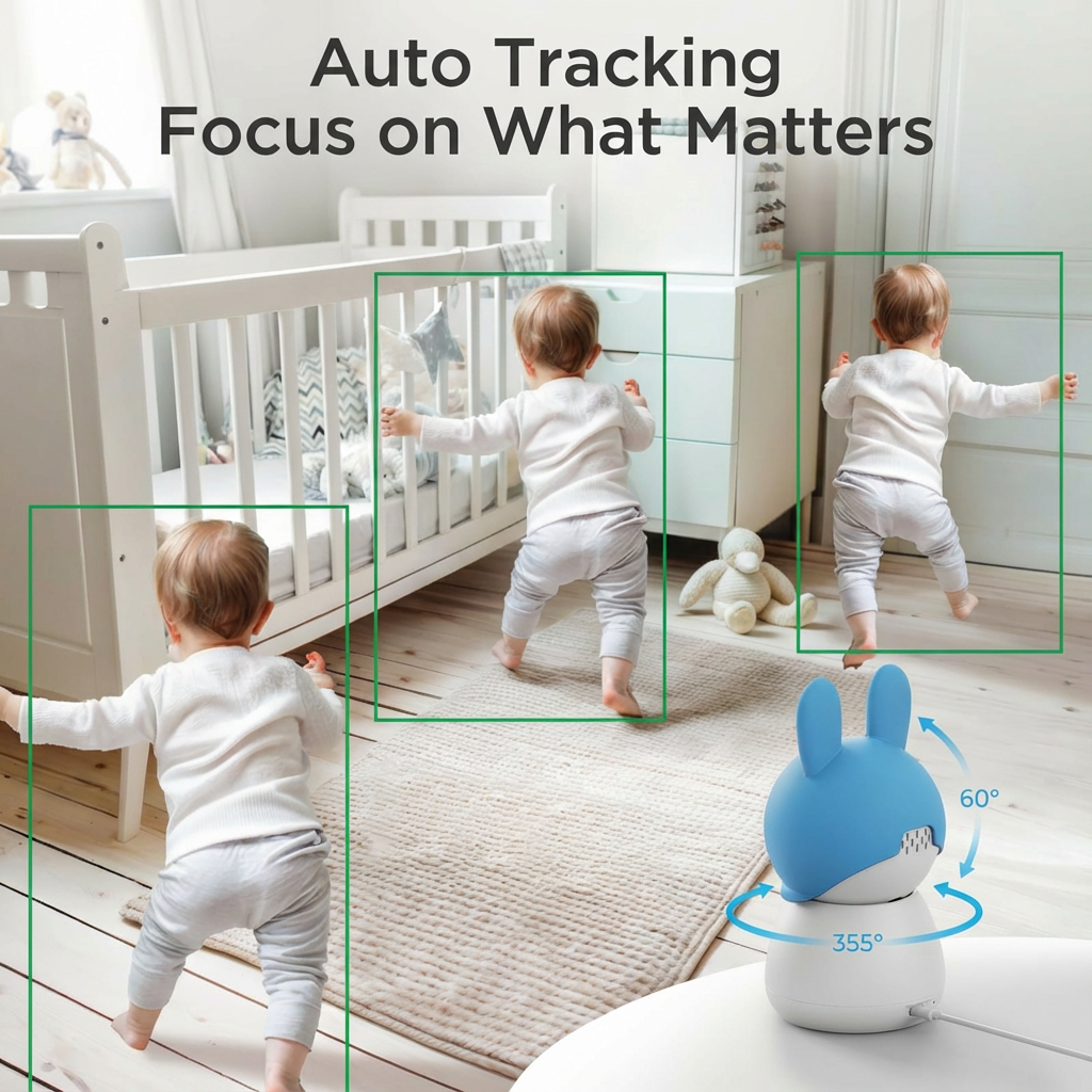 The baby monitor delivers 2K 4MP resolution with HD lens technology that shows every detail clearly. Parents can see their child's movements and expressions with excellent picture quality, making it easy to monitor safety and activities throughout the day.